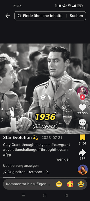 So scheint etwa die (Wieder-)Entdeckung und (Neu-)Vermittlung ‹al- ter› Filmstars nur dann zu gelingen, wenn sie ‹snackable›, d. h. leicht und schnell konsumierbar ist. Eine ‹Werkschau› zum Schauspieler Cary Grant ist dann kaum länger als eine Minute und rast streng chronologisch und jahresweise durch seine Filmrollen und Fernsehauftritte (1932–1985) – ohne Nennung weiterer Eckdaten zu den jeweiligen Filmen (Abb. 1). Wie zahlreiche weitere Videos im gleichen Stil und zu anderen Schau- spieler:innen ist das TikTok unterlegt mit einem vorgeblichen «original sound», in diesem Fall schnell erkennbar als Madonnas ABBA-Coversong «Hung up», der zu Beginn immer wieder die Liedzeile «Time goes by so slowly» wiederholt. Die Videobeschreibung versammelt einige Hashtags zur Markierung des ‹Genres› (#throughtheyears) und des aktuellen platt- formspezifischen ‹Trends›, dem die Creator:in @starevolution1 das Video hinzufügen möchte (#evolutionchallenge), sowie zur möglichst breiten Streuung auf der «For You Page» der User:innen (#fyp). 2
