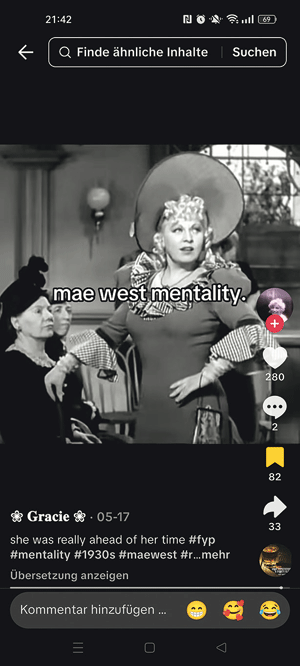 4 Zitierte Videobeispiele (letzter Zugriff jeweils am 22.11.2025): cj.valle (2021): Reply to @alarbu Any time you wanna see me— come up. #maewest #Plu- toTVDecades #oldhollywood #1940s #1930s #vintageaesthetic #vintage. TikTok [Video], 17.11.2021 [tiktok.com: https://is.gd/FyxaiM]; NoRulesFilmSchool (2025): Every Line Mae West Dropped Was a Power Move | Reel Talk. YouTube [Video], 12.07.2025 [youtube.com: https://is.gd/6CLkyv]; gracie_barlowe (2025): she was really ahead of her time #fyp #mentality #1930s #mae- west #relatable #hollywood #iconic. TikTok [Video], 17.02.2025 [tiktok.com: https:// is.gd/iENptk].